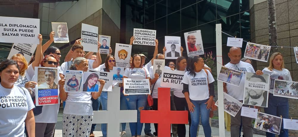 En el Centro Letonia, donde se encuentra la legación de Suiza, personal de seguridad planteó a los familiares ponerse a un costado, y así lo hicieron con sus papeles y peticiones. Sin embargo, optaron por volver a la entrada del edificio porque, como lo indicó Diego Casanova, dirigente del Clippve, no estaban cometiendo un delito por solicitar la libertad de sus seres queridos. Funcionarios de mediación de la PNB se mantuvieron en el lugar durante toda la actividad.