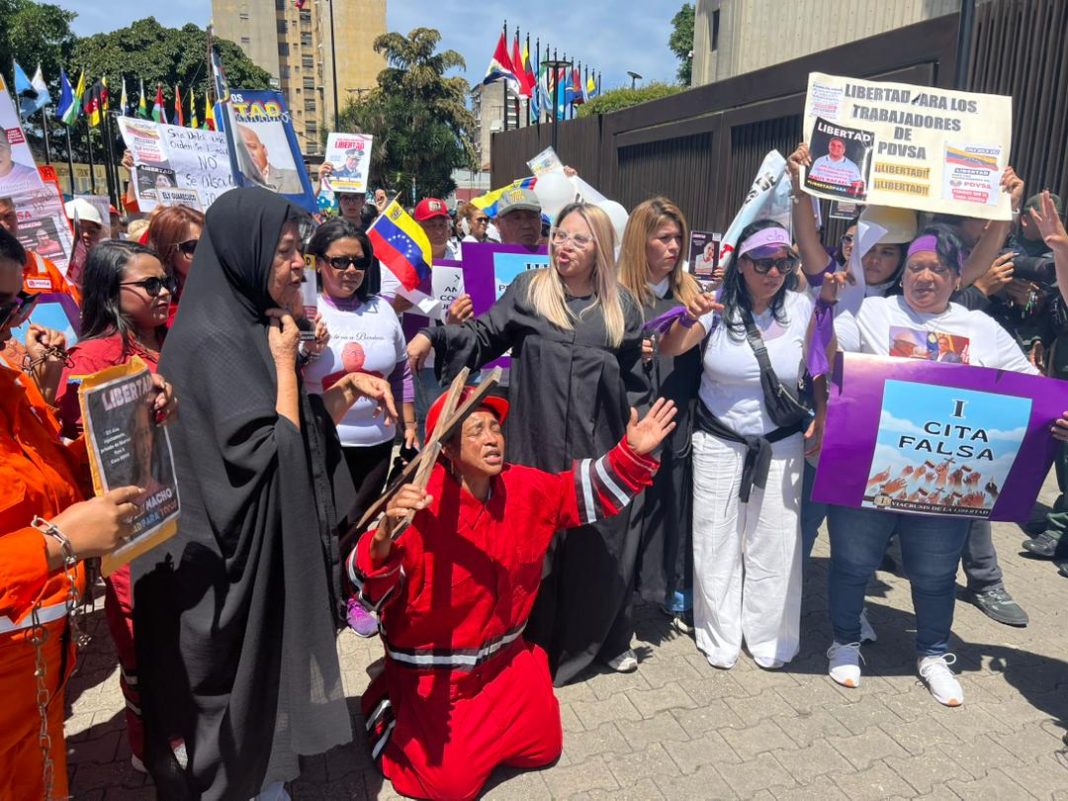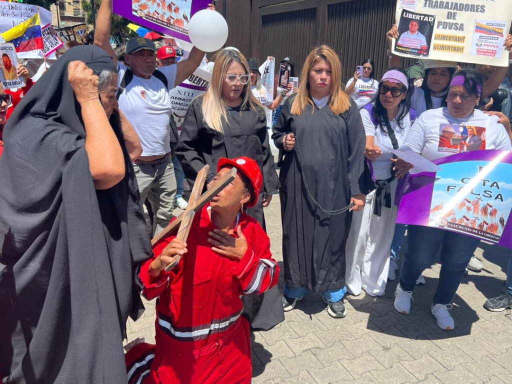 Madres, esposas, e hijos de lo más de 170 trabajadores del caso denominado “PDVSA Obrero” realizaron este viernes 20 de marzo un viacrucis viviente para escenificar “la realidad” de sus familiares quienes tienen más de un año detenidos.