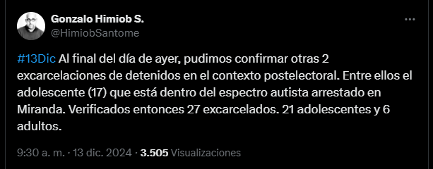 El vicepresidente de la referida ONG, Gonzalo Himiob, detalló que durante la noche del jueves #12Dic pudo verificar otras dos excarcelaciones, una de las cuales fue el adolescente de 17 años detenido en Miranda y con diagnóstico del espectro autista.