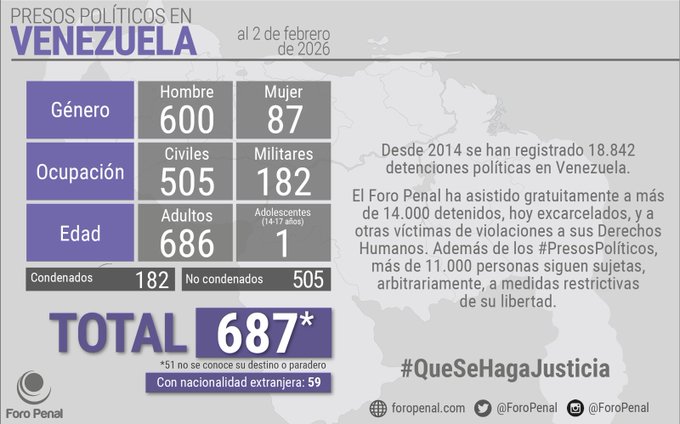 El 2 de febrero la ONG confirmó la existencia de 687 presos políticos: 600 hombres y 87 mujeres. Todavía hay un adolescente detenido, al igual que 182 militares.