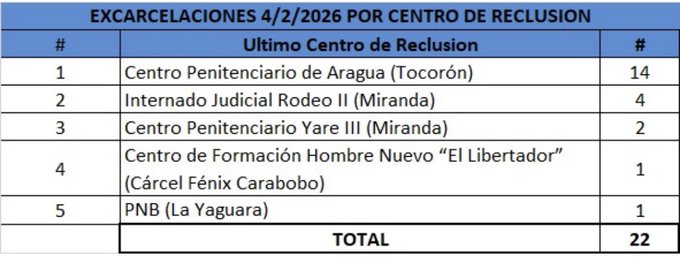 El Foro Penal confirmó al menos 22 excarcelaciones de presos políticos este miércoles 4 de febrero, como lo informó el director vicepresidente de la organización, Gonzalo Himiob.