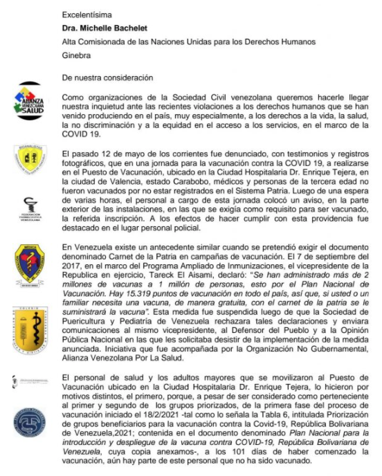 Un grupo de 40 organizaciones de la sociedad civil, entre ellas colegios y asociaciones médicas y académicas, hicieron llegar una carta a la Alta Comisionada de Naciones Unidas, Michelle Bachelet, denunciando las violaciones a los derechos humanos cometidas en Venezuela en el contexto de la pandemia por la COVID-19.