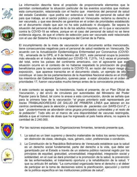 En este sentido, abordan temas como la jornada de vacunación realizada en la Ciudad Hospitalaria Dr. Enrique Tejera, en el estado Carabobo, donde el sector salud y personas de la tercera edad no fueron vacunados por no estar registrados en el Sistema Patria.