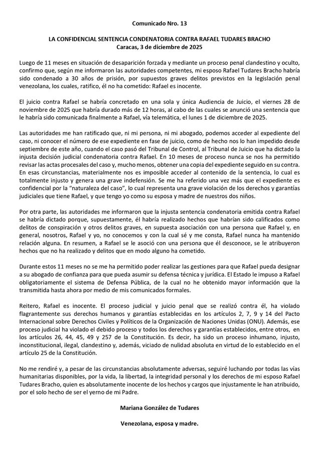 En sus redes sociales, González señaló que contra Tudares se llevó a cabo «un proceso penal clandestino y oculto», que se desarrolló «en una sola y única audiencia de juicio». Ratificó que no han tenido acceso al expediente, lo que viola los derechos y garantías judiciales.