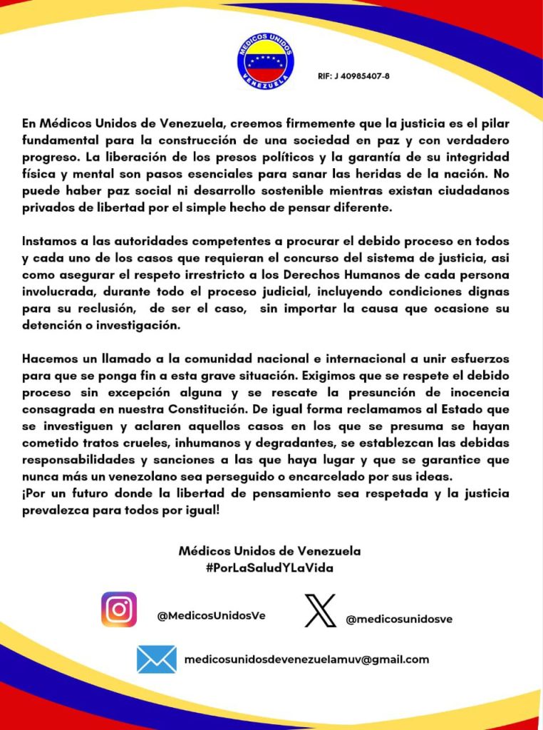 Médicos Unidos de Venezuela solicitó a las autoridades que se garantice atención inmediata para los presos políticos y sus familiares.