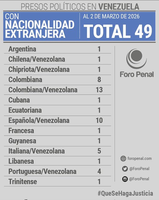 Todavía quedan en Venezuela 49 extranjeros privados de libertad por razones políticas, alertó este jueves Foro Penal.