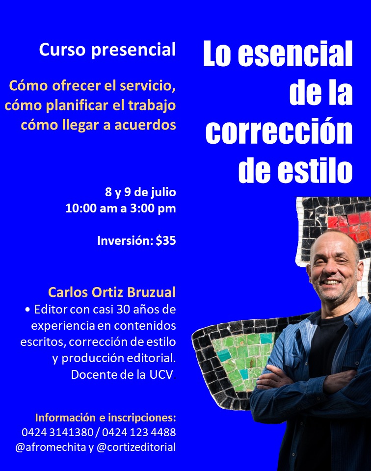 El curso estará a cargo de Carlos Ortiz Bruzual, editor y docente universitario con casi 30 años de experiencia en diseño de contenidos escritos, corrección de estilo y producción editorial. Es profesor de la Escuela de Letras de la Universidad Central de Venezuela (UCV) y de los diplomados en Edición de la UCV-Cámara del Libro y de la Unearte.