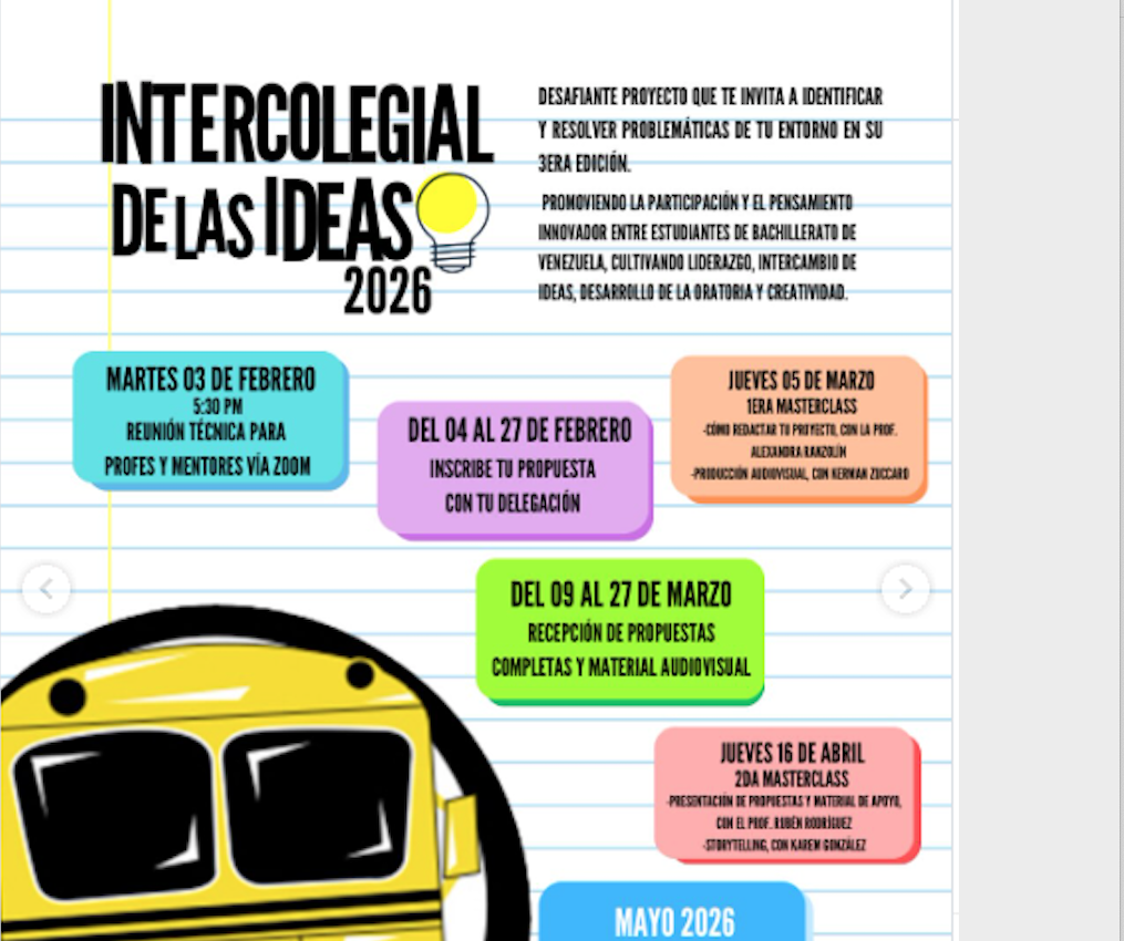 La plataforma Zona Escolar, con el apoyo de La Mega, se complacen en anunciar la tercera edición del Intercolegial de las Ideas 💡, el evento de emprendimiento escolar más relevante de Venezuela. Este programa permite a estudiantes de bachillerato transformar proyectos originales en soluciones reales para la sociedad.