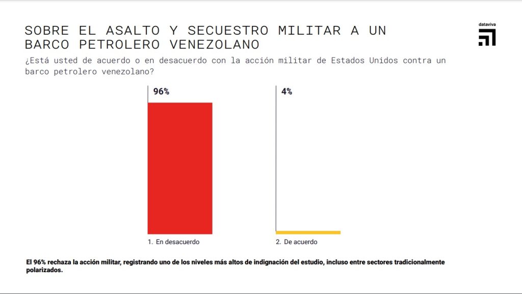 En la misma línea, el rechazo a acciones militares extranjeras alcanza niveles prácticamente unánimes. El 96% de los consultados se manifiesta en desacuerdo con una acción militar de Estados Unidos contra un barco petrolero venezolano, registrando uno de los niveles más altos de consenso observados en el estudio, incluso entre sectores tradicionalmente polarizados.