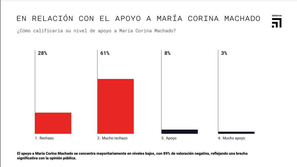 Los resultados también evidencian un aumento del rechazo y una caída sostenida del apoyo a María Corina Machado. El 89% de los entrevistados expresa rechazo o mucho rechazo hacia su figura, mientras que solo un 11% expresa apoyo o mucho apoyo, mostrando una desconexión marcada con amplios sectores de la población.