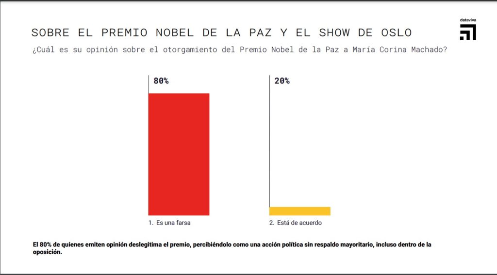 Asimismo, la encuesta revela una deslegitimación mayoritaria del Premio Nobel de la Paz otorgado a la dirigente. Entre quienes emiten opinión, el 80% considera que dicho reconocimiento es una farsa, percibiéndolo como una acción política sin respaldo social amplio ni capacidad de cohesión, incluso dentro de la oposición.