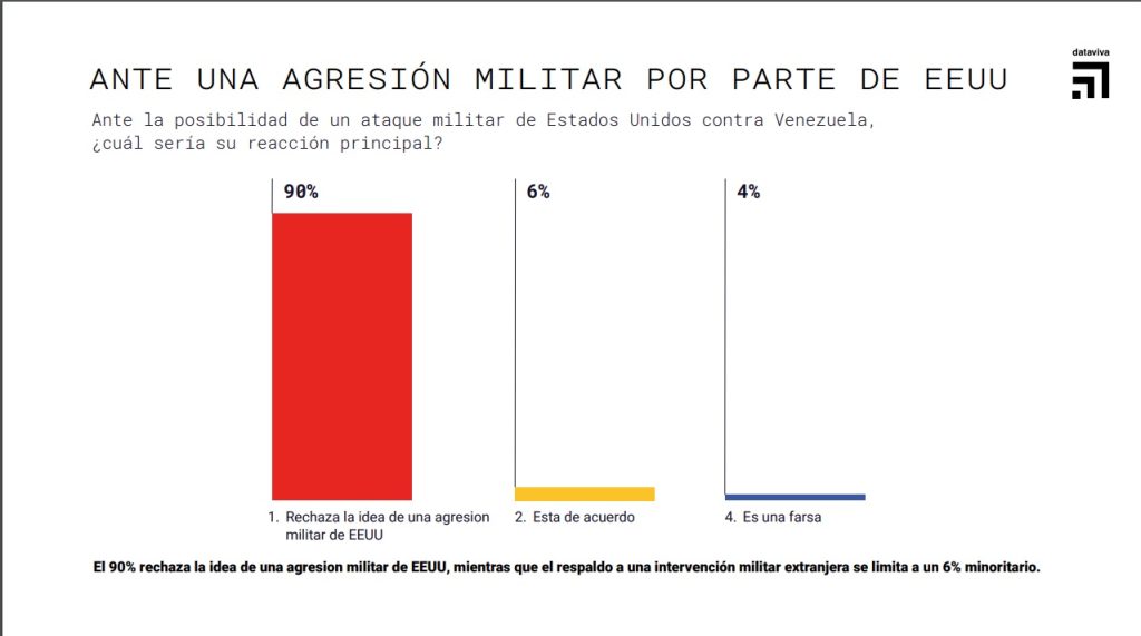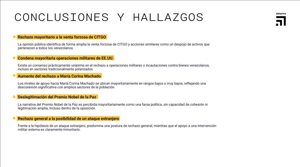 La última encuesta de alcance nacional realizada por la firma DataViva revela un rechazo mayoritario y persistente de los venezolanos frente a medidas que comprometen los activos estratégicos del país, así como a cualquier tipo de intervención militar extranjera, junto con una caída notable en el respaldo a María Corina Machado.
