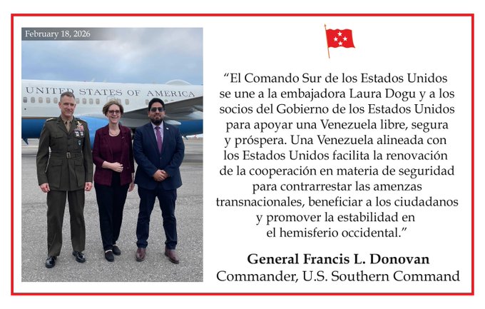 «El Comando Sur de los Estados Unidos se une a la embajadora Laura Dogu y a los socios del Gobierno de los Estados Unidos para apoyar una Venezuela libre, segura y próspera. Una Venezuela alineada con los Estados Unidos facilita la renovación de la cooperación en materia de seguridad para contrarrestar las amenazas transnacionales, beneficiar a los ciudadanos y promover la estabilidad en el hemisferio occidental», reza el mensaje suscrito por el general Francis Donovan, jefe del Comando Sur.