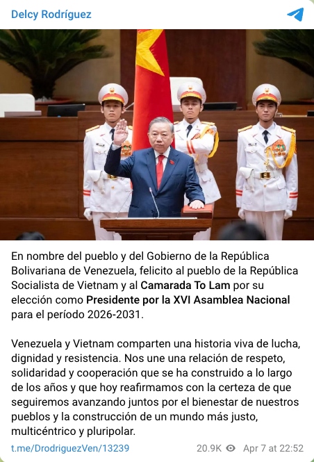 A través de su cuenta de Telegram, dijo «en nombre del pueblo y del Gobierno de la República Bolivariana de Venezuela, felicito al pueblo de la República Socialista de Vietnam y al Camarada To Lam por su elección como presidente por la XVI Asamblea Nacional para el período 2026‑2031».