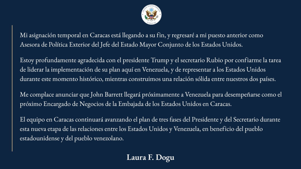 En un comunicado publicado en la cuenta en X de la Embajada de Estados Unidos en Venezuela, Dogu aseguró que su «asignación temporal en Caracas está llegando a su fin» y que Barrett, actual encargado de negocios en Guatemala, llegará «próximamente» al país para ocupar su puesto.