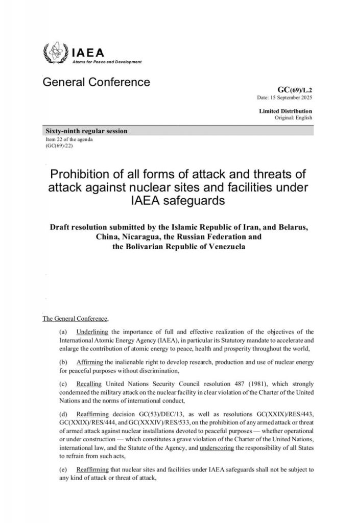 “Irán, junto con China, Rusia, Venezuela, Nicaragua y Bielorrusia, presentó un proyecto de resolución sobre la prohibición de todas las formas de ataque y amenazas de ataque contra emplazamientos e instalaciones nucleares bajo las salvaguardias del OIEA”, informó el portavoz del Ministerio de Exteriores iraní, Ismaeil Baghaei.