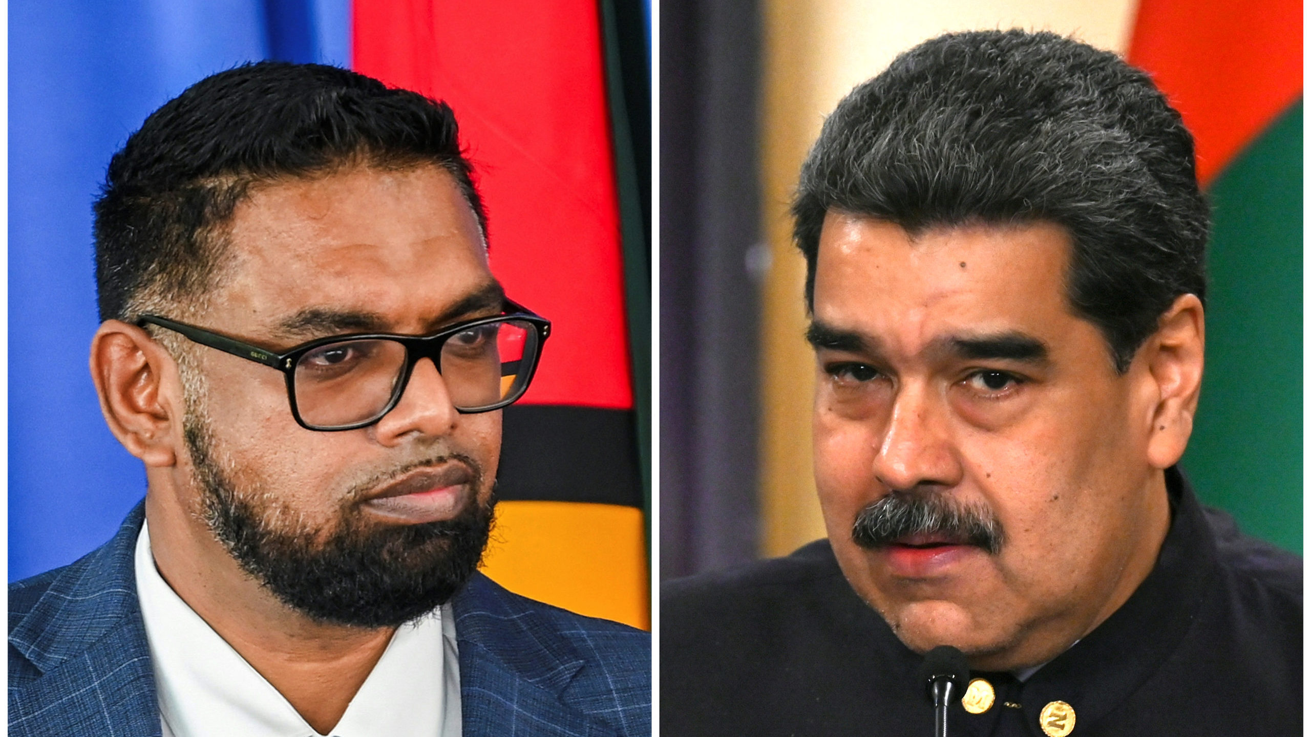 (COMBO) This combination of file pictures created on December 12, 2023 shows Guyana's President Irfaan Ali (L) speaking during a joint press conference with US Secretary of State Antony Blinken (out of frame) in Georgetown, on July 6, 2023, and Venezuela's President Nicolas Maduro speaking during a meeting with his Guinea-Bissau counterpart Umaro Sissoco Embalo (out of frame) at Miraflores Presidential Palace in Caracas, on November 2, 2022. Venezuelan President Nicolas Maduro and his Guyanese counterpart, Irfaan Ali, will meet in Saint Vincent and the Grenadines on December 14, 2023, on their countries' growing dispute over the oil-rich region of Essequibo, amid mounting international warnings against escalating the row. The meeting was called under the auspices of the Community of Latin American and Caribbean States (CELAC) and the Caribbean Community (CARICOM). (Photo by Keno GEORGE and Federico PARRA / AFP)