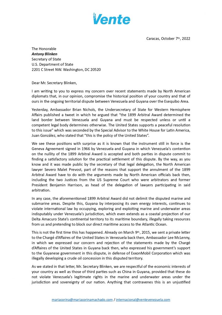 Machado envió una carta al secretario de Estado, Antony Blinken, ante sus recientes declaraciones en las que reconoce el laudo arbitral de 1899 y no el Acuerdo de Ginebra.
