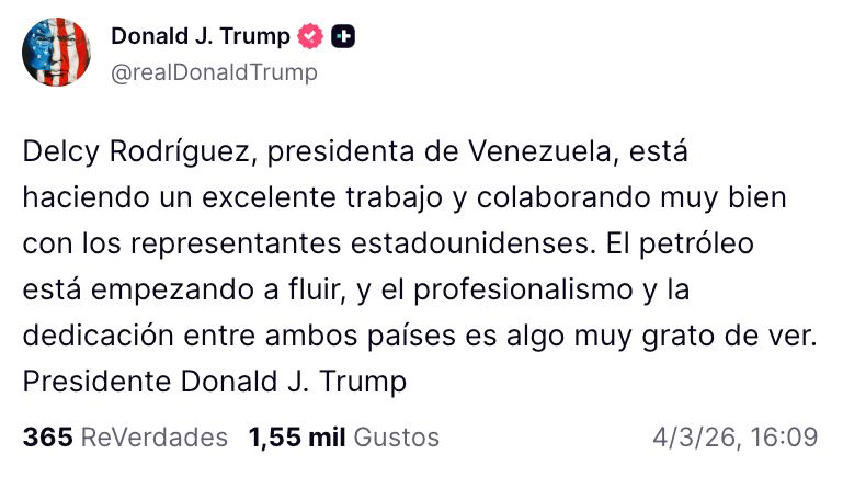 «Delcy Rodríguez, presidenta de Venezuela, está haciendo un excelente trabajo y colaborando muy bien con los representantes estadounidenses”, escribió.