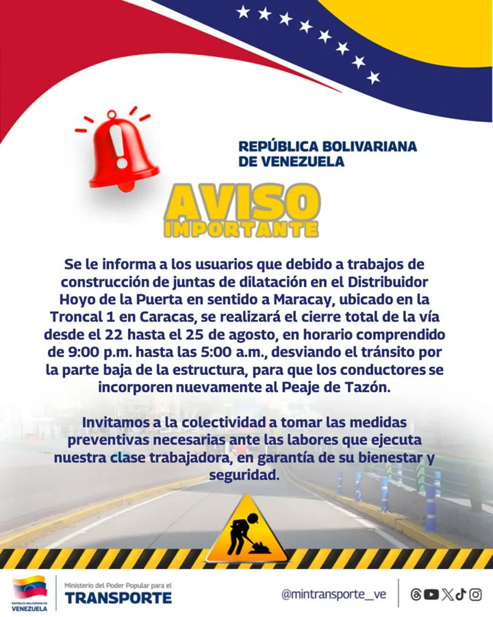 Desde este viernes #22Ago, y hasta el próximo lunes #25Ago realizarán trabajos de construcción de juntas de dilatación en el Distribuidor Hoyo de la Puerta, sentido Maracay, por lo que la arteria vial permanecerá parcialmente cerrada por al menos ocho horas durante los días de trabajos.