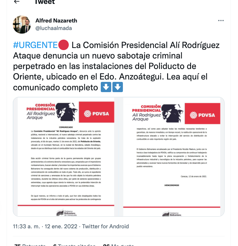 «Esta acción criminal forma parte de la guerra permanente dirigida por grupos pertenecientes a la extrema derecha venezolana que, amparados por el imperialismo norteamericano, buscan atentar y boicotear los importantes avances que el Gobierno Bolivariano ha conseguido dentro del nuevo sistema de producción, distribución y comercialización de combustibles en todo el país», señalan en el comunicado.