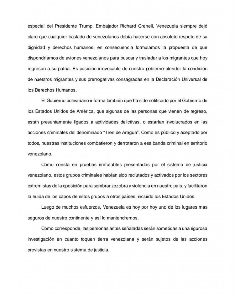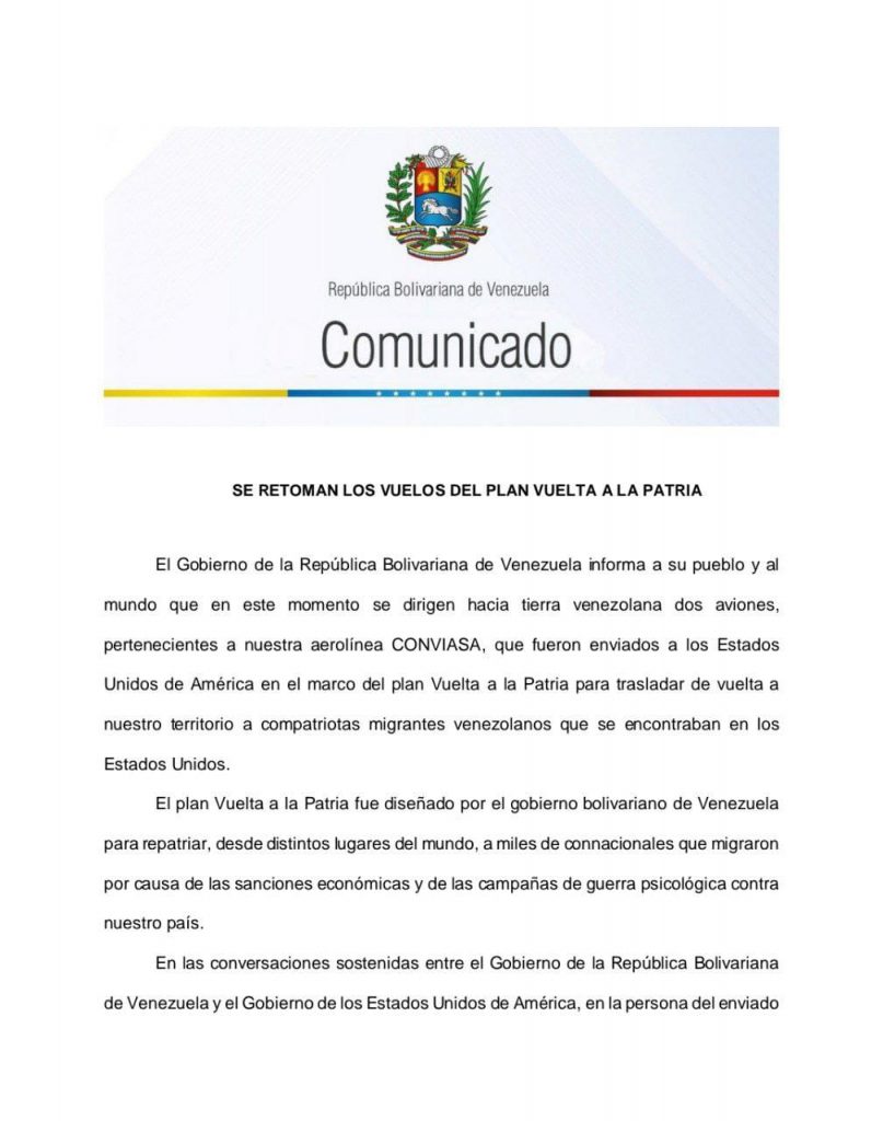 Pasadas las 3:30 de la tarde la administración de Maduro dijo que dos aviones de la estatal Conviasa volaban desde territorio estadounidense hacia Venezuela, sin especificar el número de migrantes retornados.