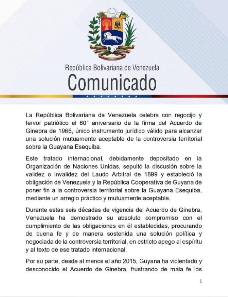también denuncia que que Guyana, «desde al menos el año 2015», ha «violentado y desconocido el Acuerdo de Ginebra, frustrando de mala fe los procesos de buenos oficios y procurando obtener títulos territoriales que nunca ha poseído, a través de una írrita demanda unilateral ante la Corte Internacional de Justicia, que carece de jurisdicción para dirimir esta controversia».