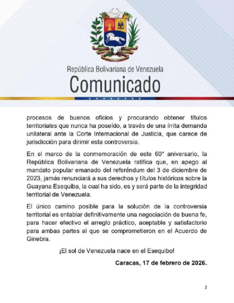 Al cumplirse 60 años la firma del Acuerdo de Ginebra, a traves de un comunicado «la república Bolivariano de Venezuela señala que «jamás renunciará a sus derechos y títulos históricos sobre la Guayana Esequiba, la cual ha sido, es y será parte de la integridad territorial de Venezuela».