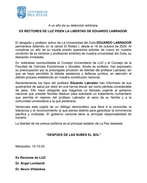 Los firmantes, en su condición de autoridades académicas retiradas, reiteran su llamado al cumplirse un año de lo que califican como una «injusta prisión». Subrayan que tanto el Consejo Universitario de LUZ como el Consejo de la Facultad de Ciencias Económicas y Sociales (FCES), donde el profesor Labrador imparte clases, han manifestado previamente su profunda preocupación por la prolongada privación de libertad y la falta de garantías procesales.