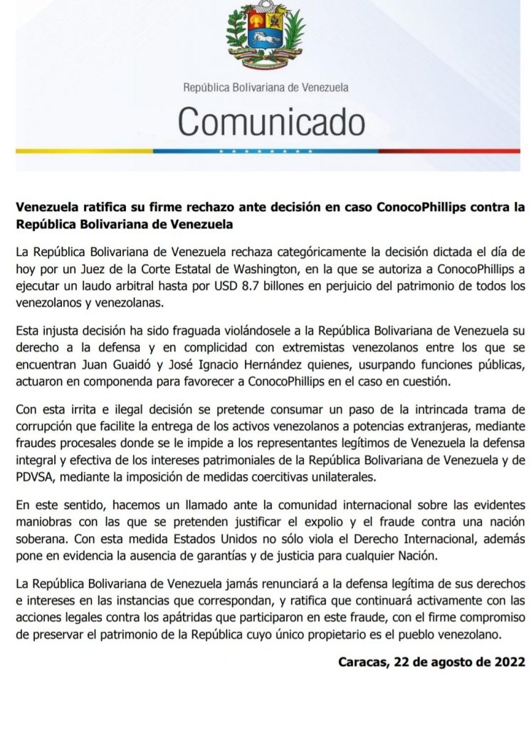 El gobierno de Nicolás Maduro rechazó este lunes el fallo de un juez de Estados Unidos a favor de la empresa ConocoPhilles, en la que ordena al país el pago de $ 8.700 millones por expropiaciones.