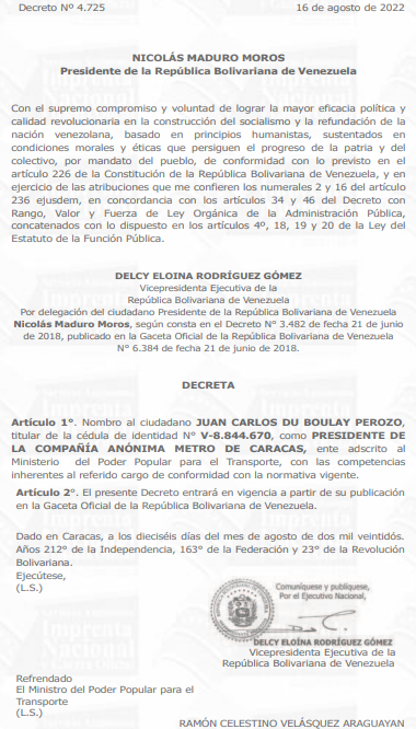 Nicolás Maduro designó al mayor general, Juan Carlos Du Boulay Perozo, como nuevo presidente del Metro de Caracas, en sustitución de Graciliano Ruiz Gamboa. El nombramiento se hizo en la Gaceta Oficial número 42.441.