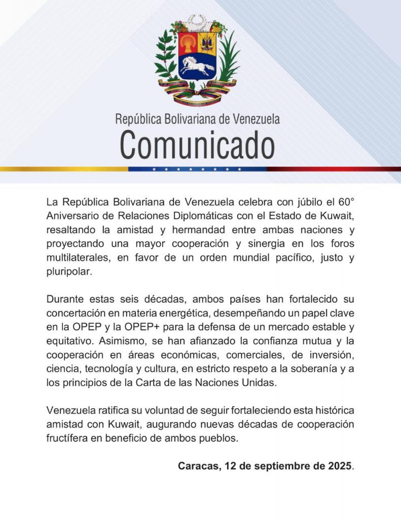 Enlace que ha afianzado la confianza mutua y la cooperación en áreas económicas, comerciales, de inversión, ciencia, tecnología y cultura, en estricto respeto a la soberanía y a los principios de la Carta de las Naciones Unidas, y que Venezuela ratifica su voluntad de seguir fortaleciendo esta histórica amistad con Kuwait, «augurando nuevas décadas de cooperación fructífera en beneficio de ambos pueblos».