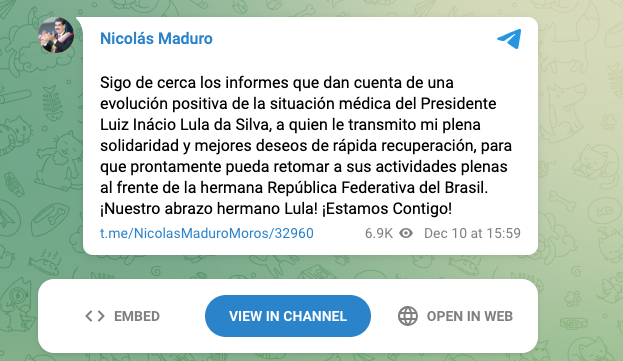 «Sigo de cerca los informes que dan cuenta de una evolución positiva de la situación médica del Presidente Luiz Inácio Lula da Silva, a quien le transmito mi plena solidaridad y mejores deseos de rápida recuperación, para que prontamente pueda retomar a sus actividades plenas al frente de la hermana República Federativa del Brasil. ¡Nuestro abrazo hermano Lula! ¡Estamos Contigo!», escribió el mandatario nacional en su canal de Telegram.