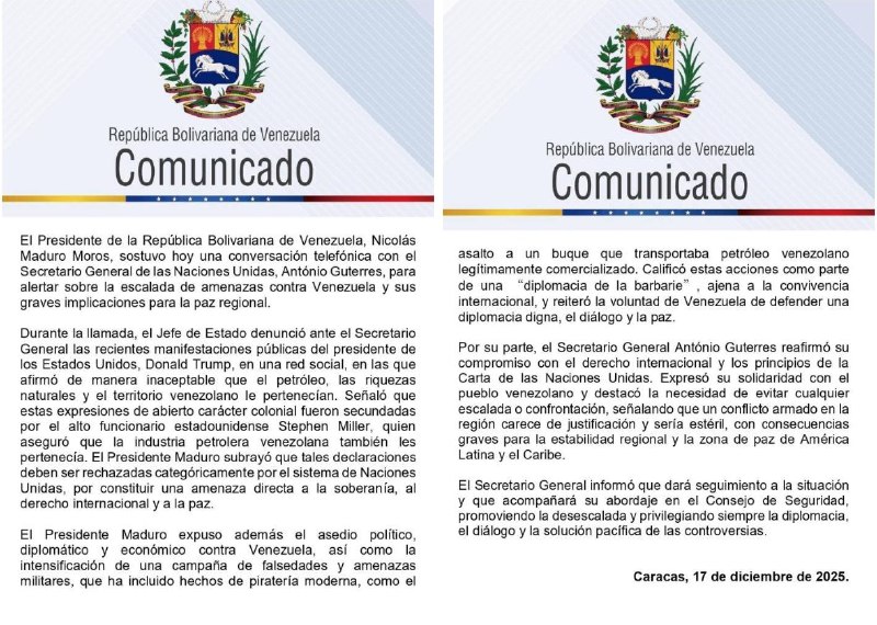 Nicolás Maduro sostuvo este miércoles una conversación telefónica con el secretario general de la Organización de las Naciones Unidas (ONU), António Guterres, en la que denunció una escalada de amenazas contra el país por parte del gobierno de Estados Unidos, encabezado por Donald Trump.