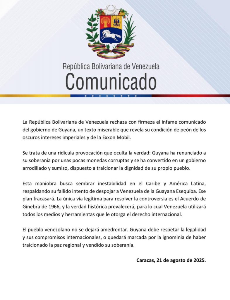 “Guyana ha renunciado a su soberanía por unas pocas monedad corruptas y se ha convertido en un Gobierno arrodillado y sumiso, dispuesto a traicionar la dignidad de su propio pueblo”, reza parte del comunicado.