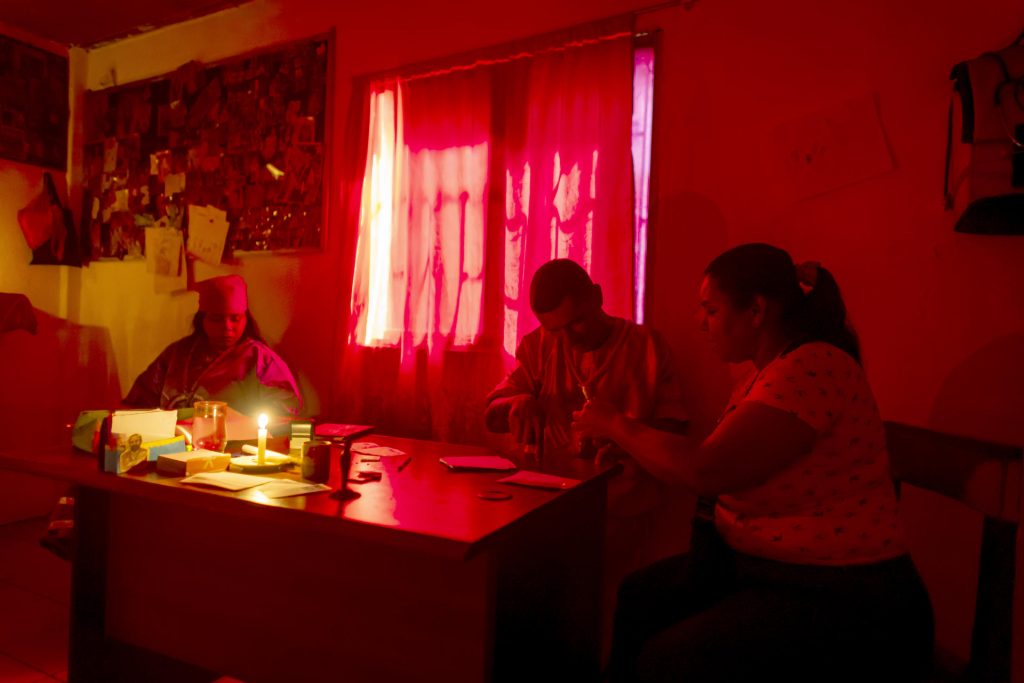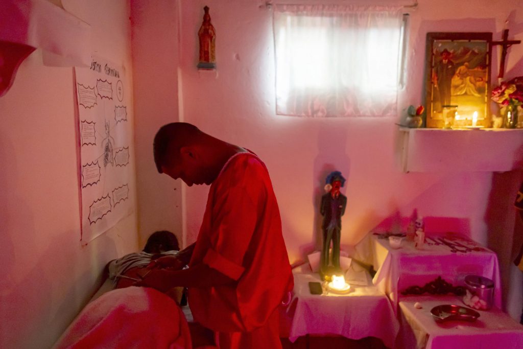 En este centro de Caracas —fundado en 1999 y ubicado en Petare, la barriada más grande de Latinoamérica—, hay hombres y mujeres que se definen como espiritistas y se llaman entre sí «hermanos», con jerarquías visibles por el color de su túnica: morada para quienes recién inician como «materia» (médiums en formación), roja para quienes cuentan con años de experiencia y marrón, el color que solo viste el jefe.