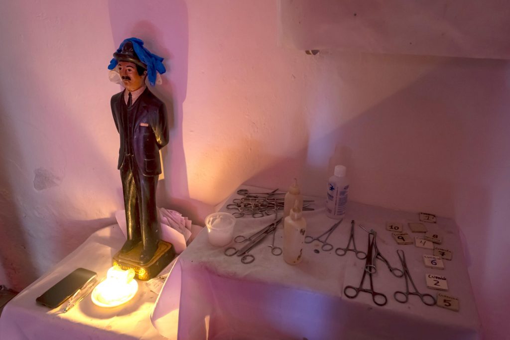 ACOMPAÑA CRÓNICA: VATICANO SANTO CARACAS (VENEZUELA), 17/10/2025.- Fotografía del 11 de octubre de 2025 que muestra un altar con la imagen del médico José Gregorio Hernández junto a implementos médicos durante una sesión espiritista de sanación, en Caracas (Venezuela). En esta sala no hay batas blancas ni estetoscopios, pero abundan los «pacientes». Quienes se preparan para atenderlos no son médicos, sino espiritistas. Aquí todos llegan buscando sanación, y para ello los médiums invocan el espíritu del médico José Gregorio Hernández, figura de culto en el sincretismo en Venezuela y quien será santo, por decreto del Vaticano, desde este domingo. EFE/ Miguel Gutiérrez