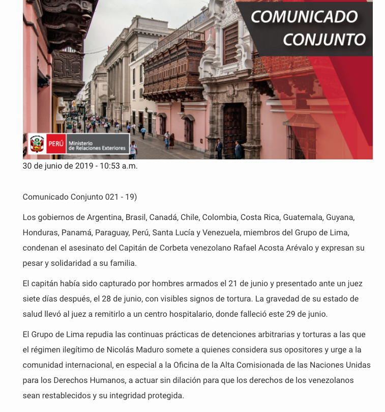En un comunicado conjunto del Ministerio de Relaciones Exteriores de Perú y de 14 países integrantes del Grupo de Lima condenaron la muerte del capitán de corbeta Rafael Acosta Arévalo ocurrida la madrugada de este sábado, presuntamente por secuelas de torturas.