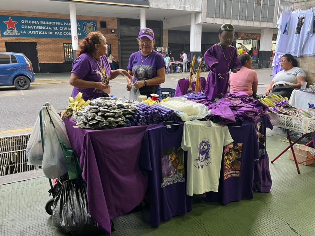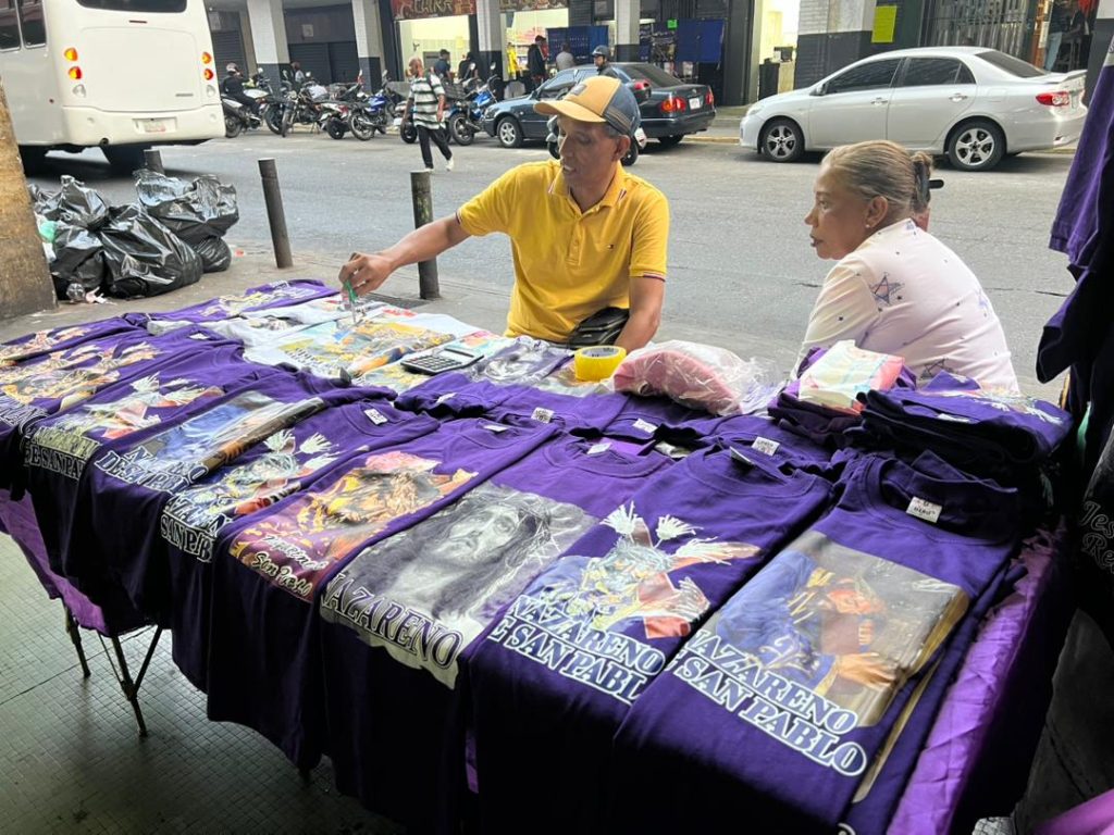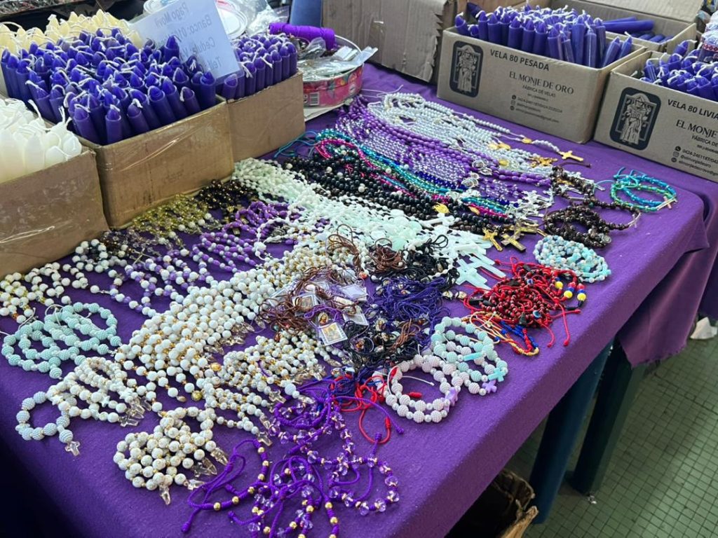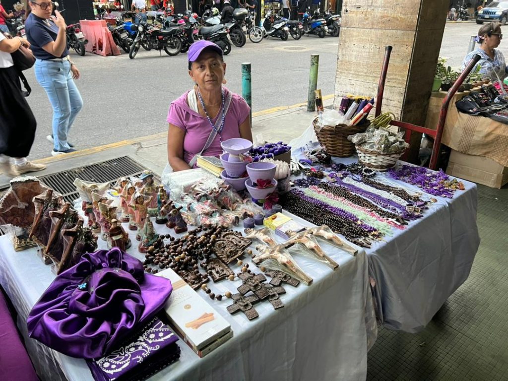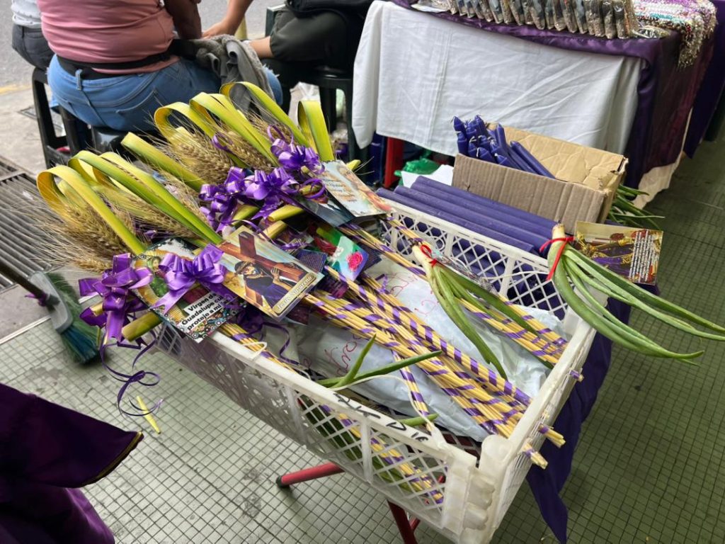 Palmas benditas, velas, túnicas moradas, rosarios, pulseras y sahumerios, estos son algunos de los objetos ofrecidos por los comerciantes informales. «Todo barato», dijo entre risas uno de los entrevistados por el equipo reporteril de Contrapunto.com.