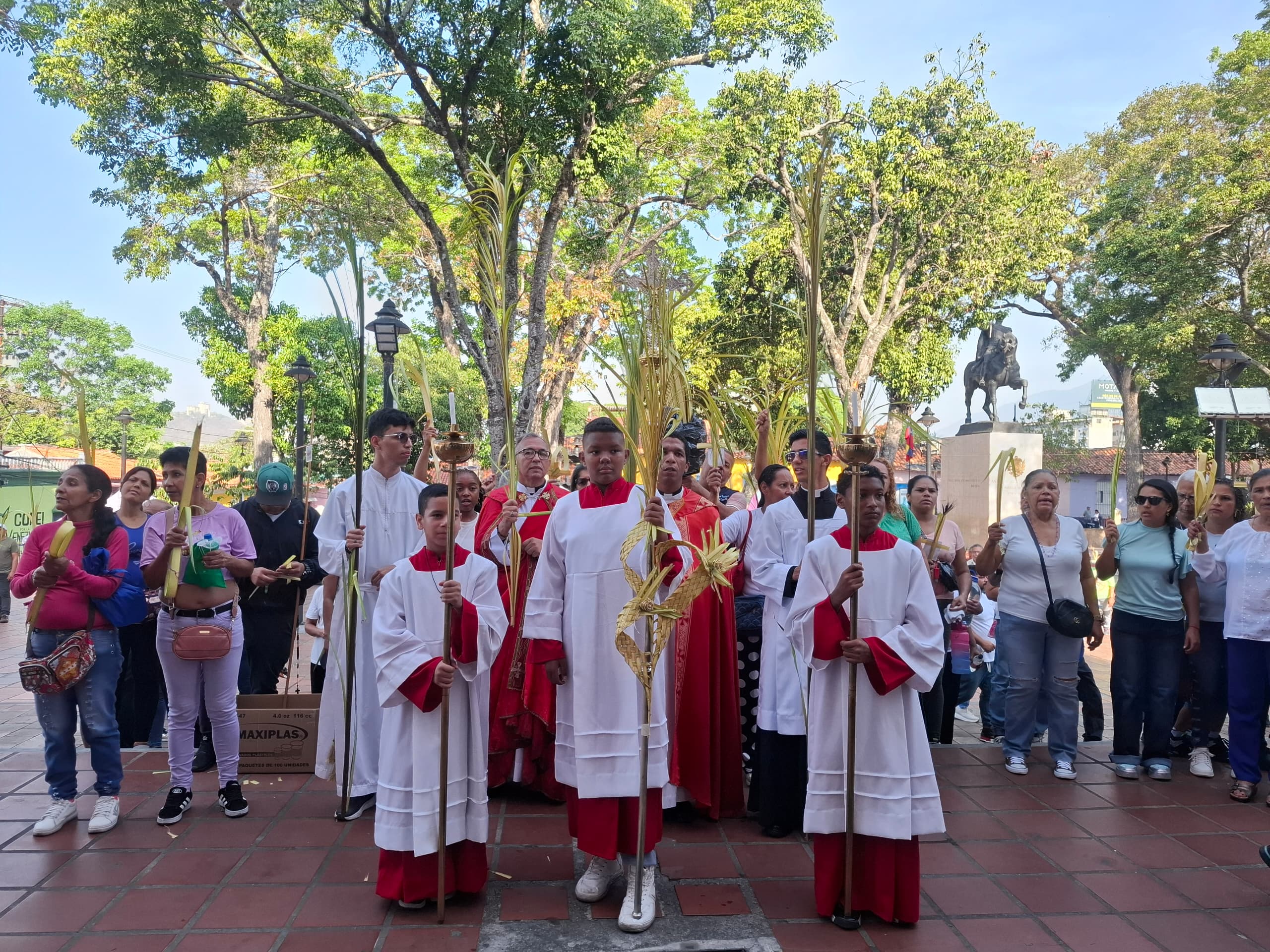 La ceremonia comenzó a las 8:00 am, y el sacerdote inició la charla y la bendición de las palmas a las afueras de la iglesia, donde se congregaron más de 200 fieles en la Plaza Sucre, en el casco histórico de Petare.