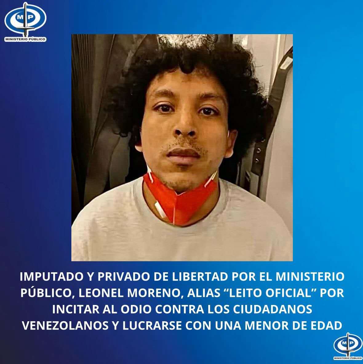 El Fiscal General, Tarek William Saab, informó que la Fiscalía 45 Nacional contra Delitos Comunes y la Fiscalía 79 Nacional en Materia de Protección Integral de la Familia imputó a Leonel Moreno (alias Leito Oficial), por los delitos de Promoción e Incitación al Odio y Lucro por Trabajo de Niño o Niña.