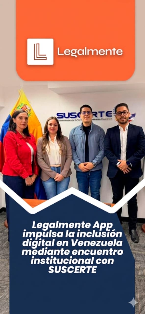 Legalmente App, la plataforma Legaltech diseñada para impulsar el acceso a la asistencia jurídica en Venezuela, sostuvo un importante encuentro institucional con los entes reguladores del país para promover la inclusión digital. La reunión contó con la destacada participación del Ingeniero Gerardo Gómez Romero, Superintendente de Servicios de Certificación Electrónica (SUSCERTE); la Abg. Mónica Lugo, Consultora Jurídica, y Teresita Balsa, Directora Ejecutiva de dicha institución. En esta jornada de trabajo con el ente adscrito al Ministerio del Poder Popular para Ciencia y Tecnología (MINCYT), se afianzó la integración de firmas electrónicas dentro de su ecosistema, las cuales serán emitidas por un proveedor de servicios de certificación debidamente acreditado por dicha institución.