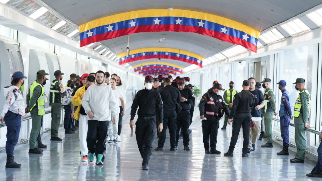 La directora del Plan Vuelta a la Patria, Camilla Fabri, junto con funcionarios del Cuerpo de Investigaciones Científicas, Penales y Criminalísticas (CICPC), Servicio Bolivariano de Inteligencia Nacional (Sebin), Guardia Nacional Bolivariana (GNB), Cuerpo de la Policía Nacional Bolivariana (CPNB) recibieron a los migrantes en Maiquetía.