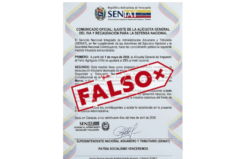 Una imagen que circula en plataformas digitales, atribuida falsamente al Servicio Nacional Integrado de Administración Aduanera y Tributaria (Seniat), asegura un supuesto incremento del Impuesto al Valor Agregado (IVA) al 25 % a partir del primero de mayo. El texto sostiene que los fondos recaudados serían destinados a la defensa de Nicolás Maduro y Cilia Flores; sin embargo, se ha confirmado que la información es totalmente falsa y no existe ningún pronunciamiento oficial que respalde tal medida.