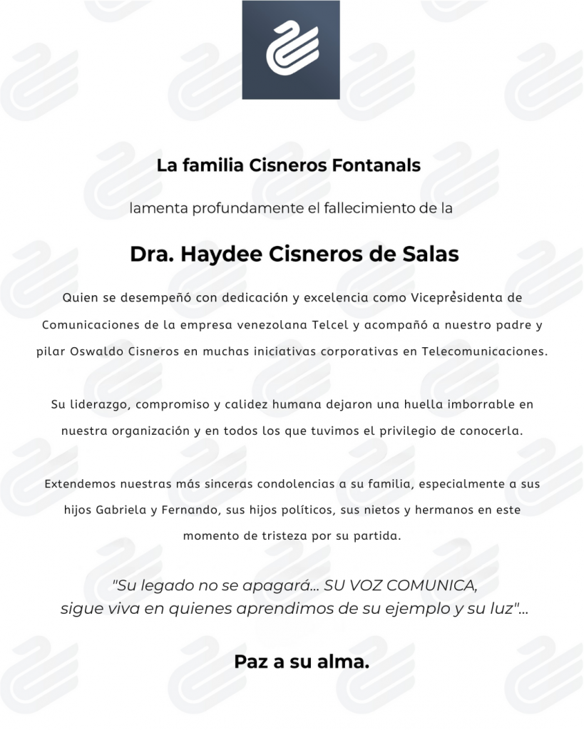 Falleció la Dra. Haydeé Cisneros de Salas, cuya destacada trayectoria se desarrolló en el ámbito gremial y empresarial de Venezuela. La Dra. Cisneros de Salas ejerció una labor significativa en diversas instituciones de gran relevancia, incluyendo Telcel, el Banco Consolidado, la Cámara de Comercio de Caracas y la Bolsa de Valores de Caracas. Su compromiso con el trabajo gremial la consolidó como una figura de referencia profesional en el sector.