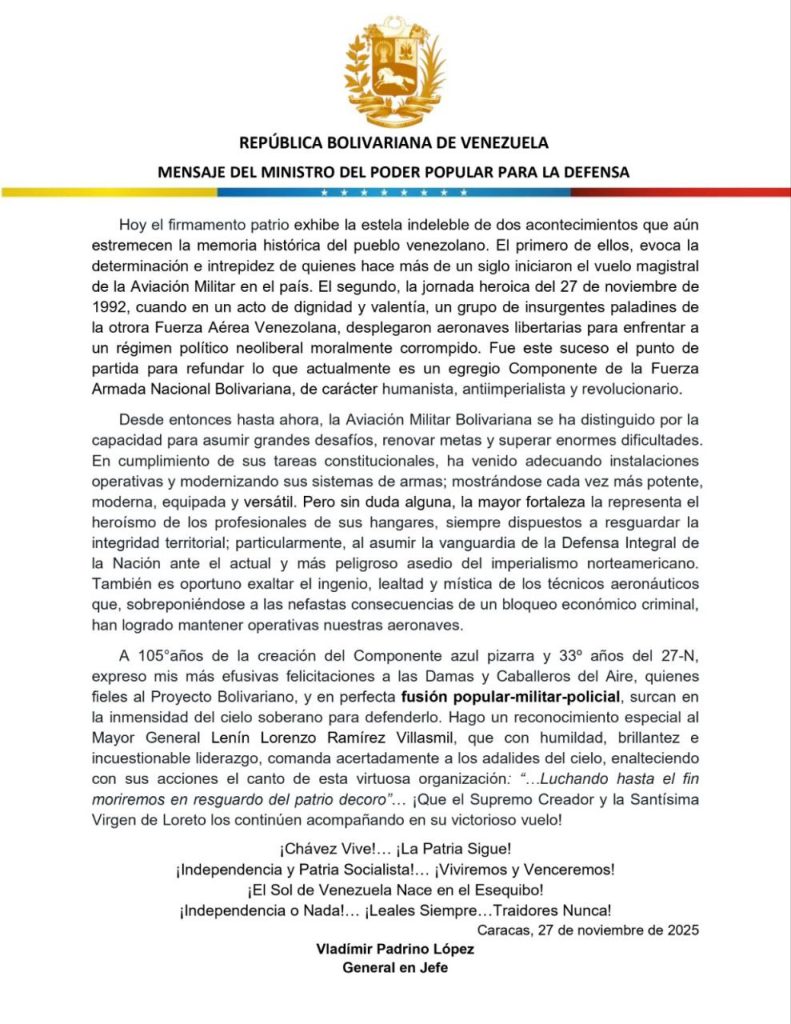El ministro de la Defensa, G/J Vladimir Padrino López, extendió su felicitaciones a los integrantes de la Aviación Militar Bolivariana por sus 105 aniversario y conmemoró los 33 años del 27 de noviembre de 1992, cuya «rebelión anti neocolonial y anti neoliberal» dio la «partida para refundar lo que actualmente es un egregio Componente de la Fuerza Armada Nacional Bolivariana, de carácter humanista, antiimperialista y revolucionario».