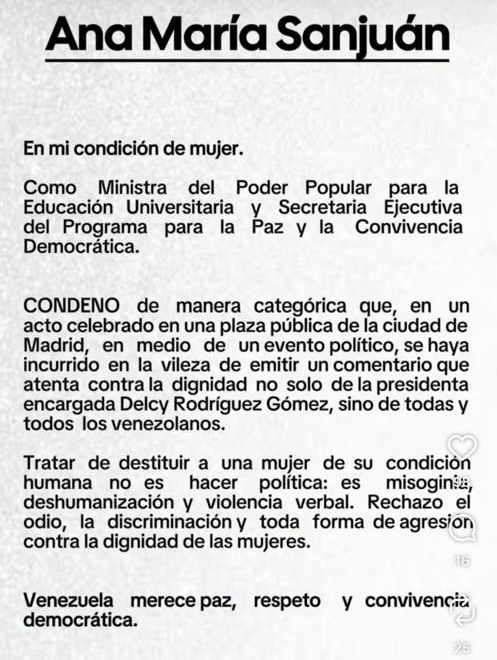 A través de una declaración oficial, Sanjuán calificó como una «vileza» los comentarios emitidos en la plaza pública española, señalando que estos no solo atentan contra la figura de la mandataria, sino contra la dignidad de todo el pueblo venezolano. «Tratar de destituir a una mujer de su condición humana no es hacer política: es misoginia, deshumanización y violencia verbal», sentenció la ministra.