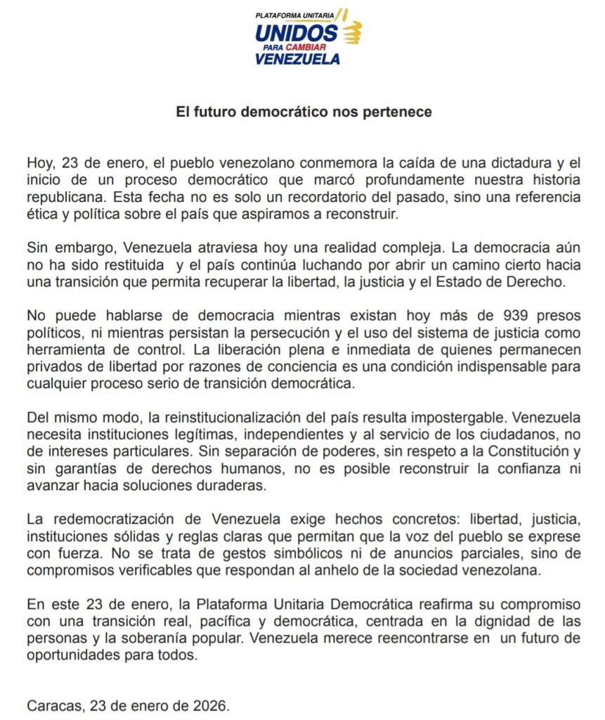 La Plataforma Unitaria subrayó este viernes que la redemocratización de Venezuela «exige hechos concretos» como «libertad, justicia, instituciones sólidas y reglas claras que permitan que la voz del pueblo se exprese con fuerza».