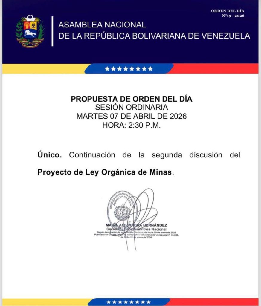 La Asamblea Nacional (AN) debatirá este martes 7 de abril de 2026, la continuación de la segunda discusión del Proyecto de Ley Orgánica de Minas.