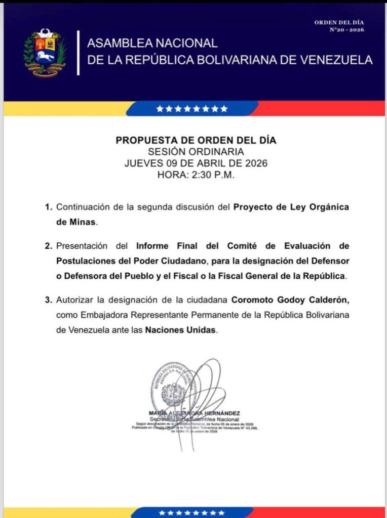 Finalmente, el Parlamento discutirá la autorización para la designación de Coromoto Godoy Calderón como Embajadora Representante Permanente de Venezuela ante la Organización de las Naciones Unidas (ONU). Godoy, diplomática de carrera, asumiría esta responsabilidad en un momento estratégico para la representación del país en el escenario multilateral.